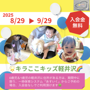 会場:キラここキッズ軽井沢&ふるさと公園時間:10-12時(一時保育は最大9-13時までご利用頂けます)参加費:一時保育料金(入会金無料&町民料金あり)*食事はご持参下さい。予約は「あすいく」からhttps://auth […]