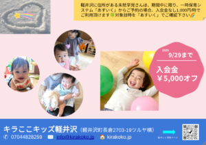 0歳児&1歳児に限定していた9月中指定日の一時保育特典(入会金無料、1,000円/時)を、お問い合わせの多い小学校入学前までの軽井沢町民に拡大します。休園日や参観日、学校説明会、ご家族の用事がある週末など用途を問わずお気 […]